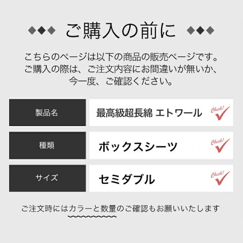 商品詳細 仕様 ●ボックスシーツ セミダブルサイズ 1枚 120X200X30cm (重量:約540g) マットレスの厚み25cm程度まで対応可能 全周スパンゴム入り 側面片側にハギ(布の継ぎ目)が入ります。