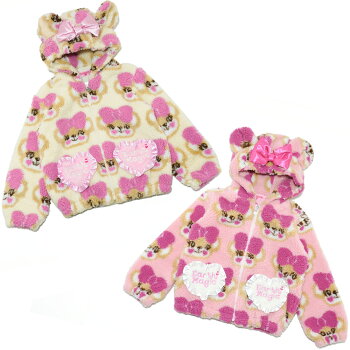 冬はもこもこのボア生地にたくさんマフィーちゃんをつめ込んだ、スタッフトマフィー総柄です♡ 見ているだけで暖かな気分になれるボア生地のジップアップブルゾン♥ フードにはアースガールが大好きなクマ耳とサテンリボンがついています☆