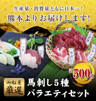 【ふるさと納税】馬刺し5種バラエティーセット 500g 御船屋《30日以内に順次出荷(土日祝除く)》馬刺し 馬肉 上赤身馬刺し ハツ サガリ フタエゴ馬刺し コウネ 醤油 生姜 ショウガ
